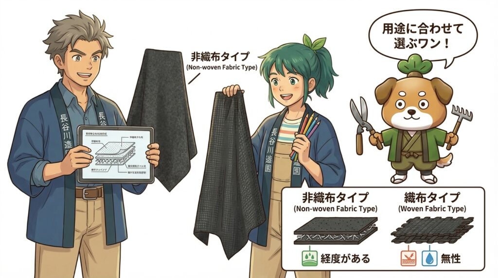 防草シートの素材には大きく分けて不織布タイプと織布タイプがあります。不織布タイプは繊維をランダムに重ねて圧着したシートで、柔らかく施工しやすい点が特徴。細かい隙間が少ないため、雑草が生えにくいメリットがあります。