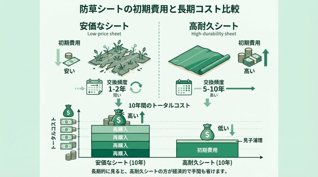 防草シートを選ぶ際は、単に初期費用だけを見るのではなく、耐久性や交換頻度など長期的なコストバランスまで検討することが重要です。安価なシートは一見お得に思えますが、破れやすく短期間で交換が必要になる場合もあり、結果的にコストがかさむこともあります。