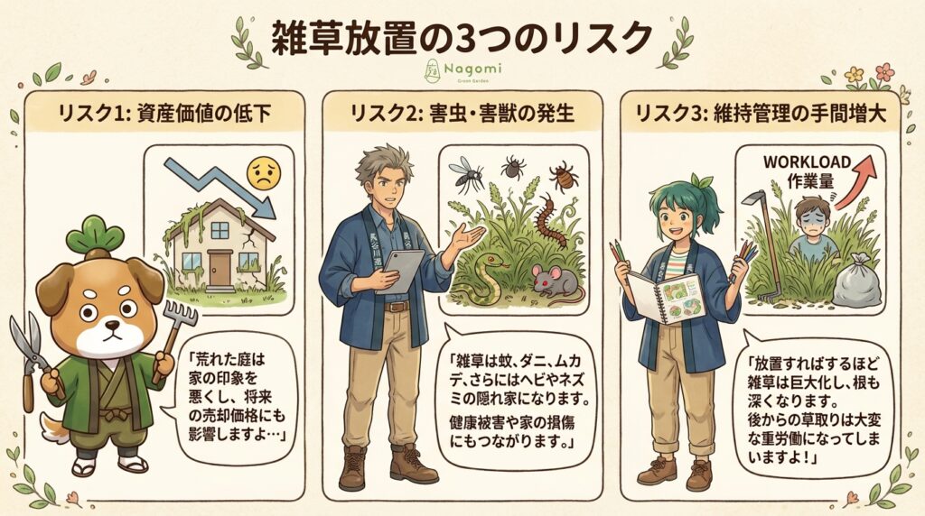 雑草をそのままにしておくと、見た目が損なわれるだけではありません。資産価値の低下や、害虫・小動物の温床となるリスクも高まります。また、手入れの手間やコストも年々増加しやすく、後から後悔するケースが少なくありません。