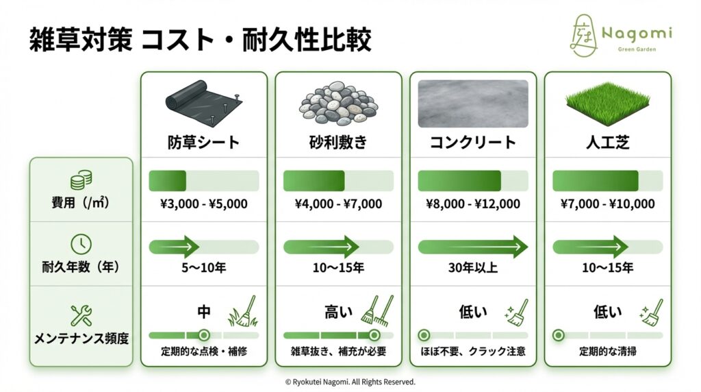 こうした方法は初期費用や施工手間が異なりますが、耐久年数やメンテナンス頻度にも大きく影響します。ご自身の敷地やご予算、将来の使い道を考慮して最適な方法を選ぶことが、後悔しない雑草対策のコツです。