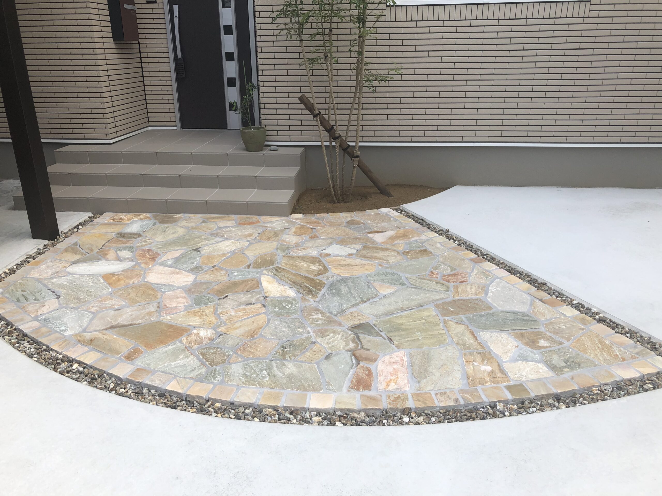 乱形石張りアプローチで彩るエントランス 公開日:2025年9月28日 福井市N様邸 玄関までのアプローチに、温かみのある天然石を使用した乱形石張りを施工しました。色味や形の異なる石を丁寧に組み合わせ、自然な風合いと高級感を両立。縁にはスクエアカットの石をあしらい、デザイン全体を引き締めてい […] 続きを読む